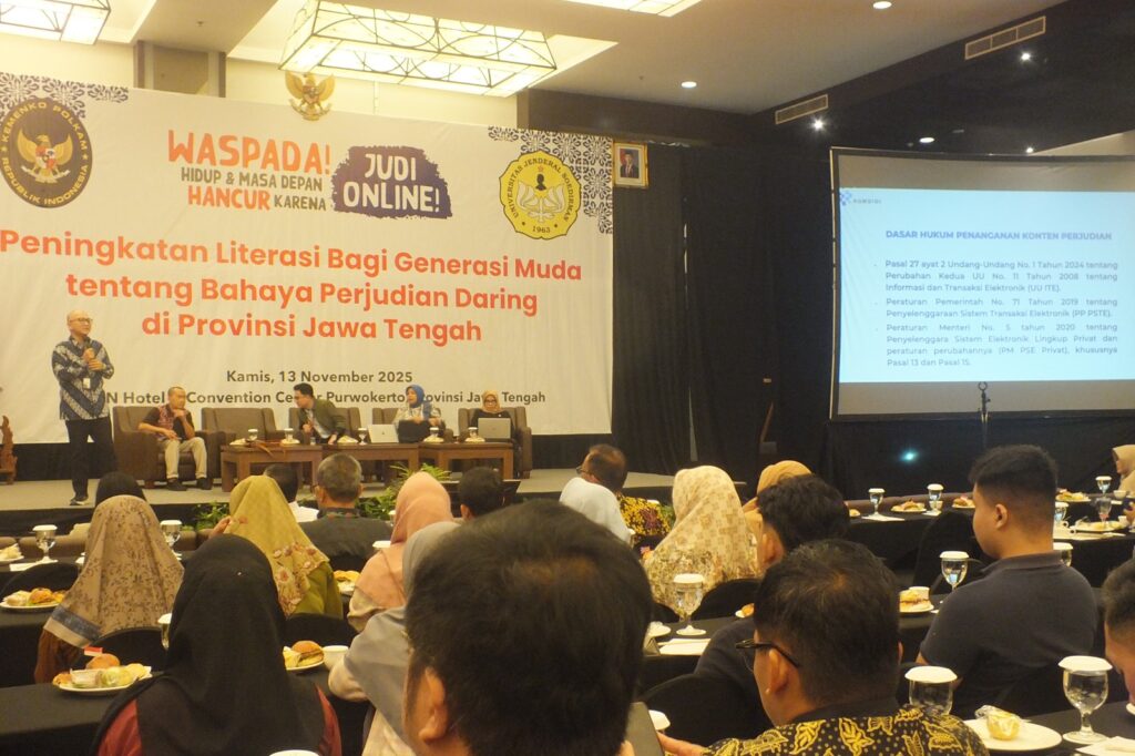 NEWSBMSTV-Purwokerto. Dalam rangka memperkuat pencegahan dan pemberantasan praktik perjudian daring di kalangan generasi muda, Kemenko Polhukam RI bekerja sama dengan UNSOED menggelar kegiatan Focus Group Discussion (FGD) bertema “Peningkatan Literasi Generasi Muda tentang Bahaya Perjudian Daring di Provinsi Jawa Tengah”, pada Kamis (13/11/25) di Hotel Aston Purwokerto.