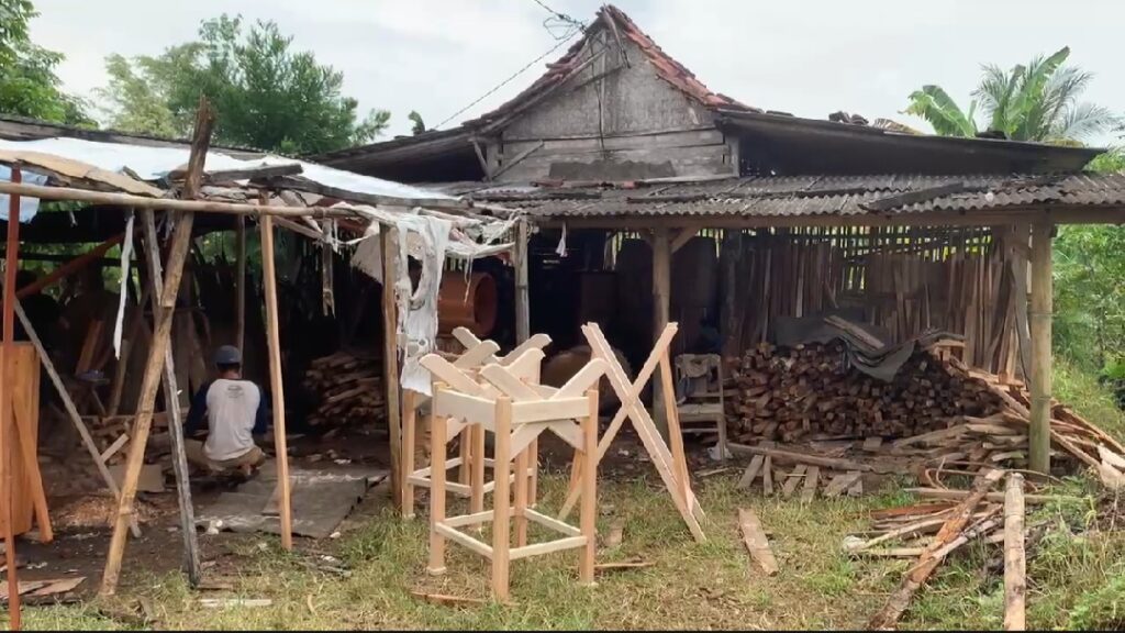 Aktivitas produksi bedug tradisional di sentra kerajinan Gema Bedug, Desa Keniten, Kecamatan Kedungbanteng, tampak berlangsung sederhana dengan tumpukan kayu bahan baku yang siap diolah, seiring meningkatnya pesanan bedug jelang bulan suci Ramadhan. (Foto: Dok. Adnan Bagus)