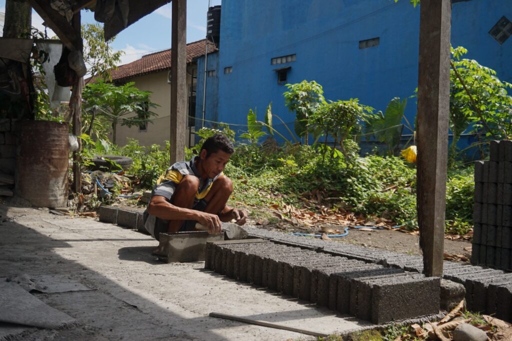 Seorang pekerja tengah melakukan proses pencetakan paving blok secara manual di Desa Cilongok, Banyumas (foto : Dok. Fazal Muhtadie)
