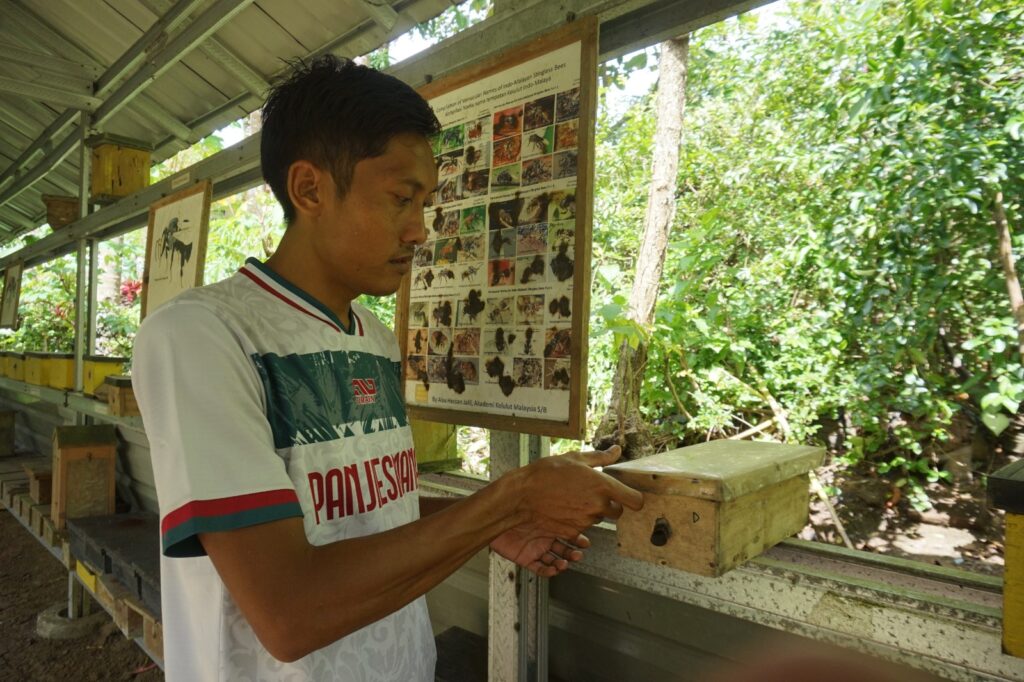 Seorang peternak lebah memeriksa kotak sarang lebah tanpa sengat di area budidaya, sebagai bagian dari perawatan dan pemantauan produksi madu yang bernilai ekonomi serta ramah lingkungan (Foto : Dok. Fazal Muhtadie)